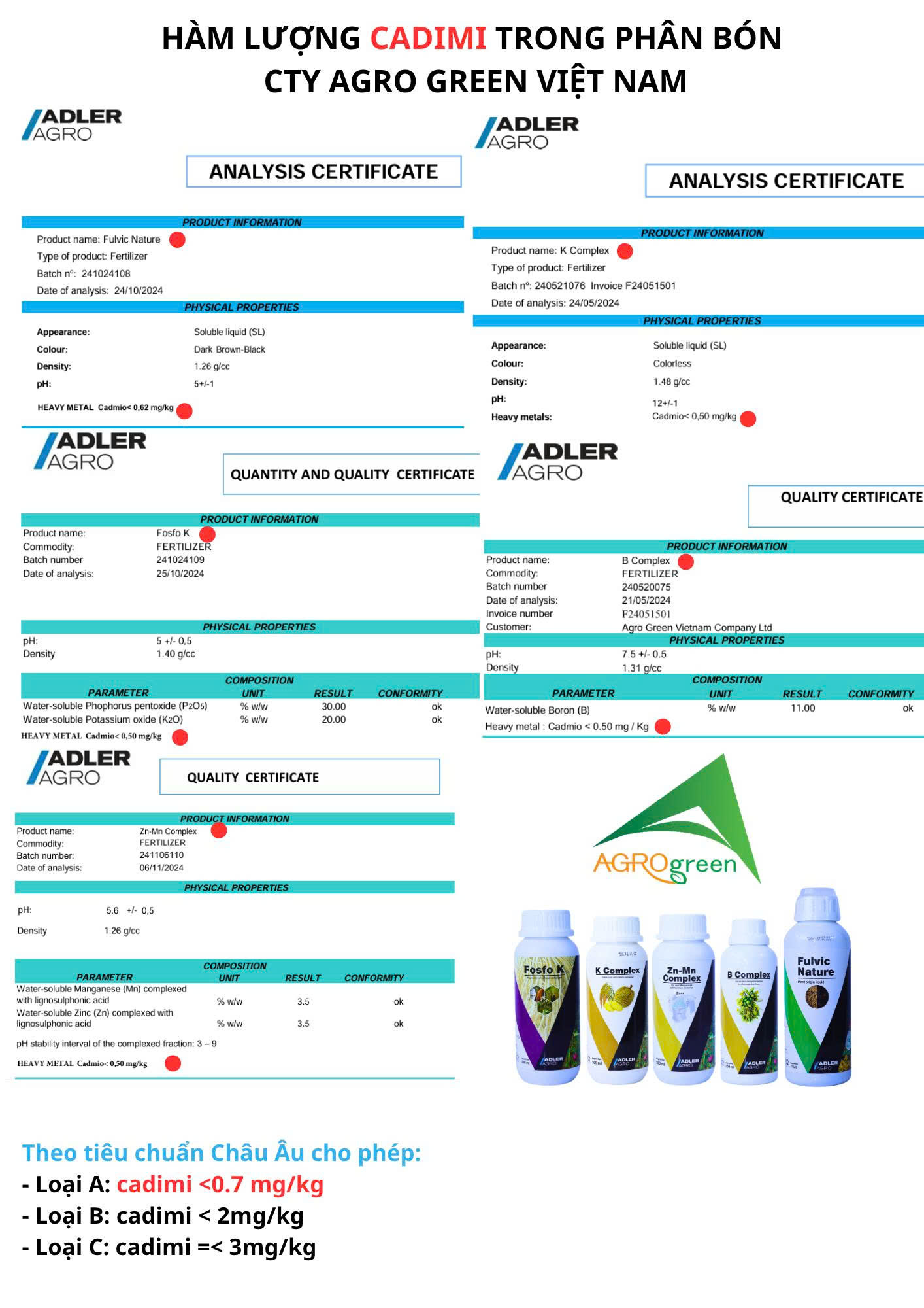 Phân bón của Agro Green nhập khẩu từ công ty Adler Tây Ban Nha thì hàm lượng Cadimi khoảng từ 0,5 mg - 0,62 mg/kg tức đáp ứng tiêu chuẩn Châu Âu và thấp hơn 8-10 lần so với tiêu chuẩn VN.