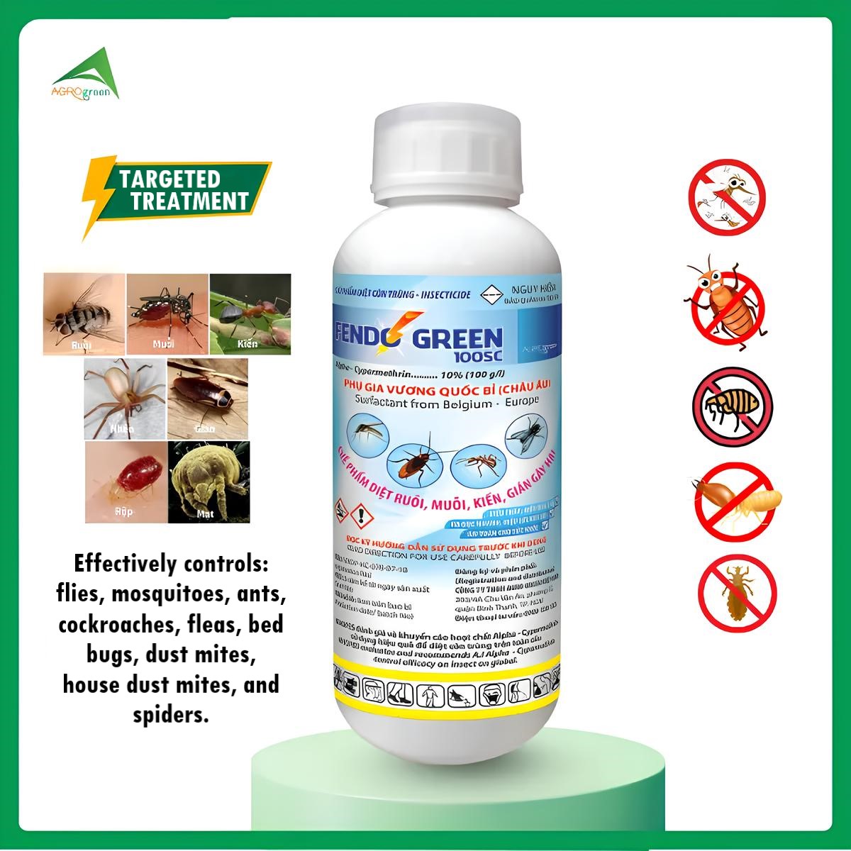 - Safe for Humans and Pets: Fendo Green 100SC has low toxicity to humans and warm-blooded animals, ensuring safety during use in living and production areas.