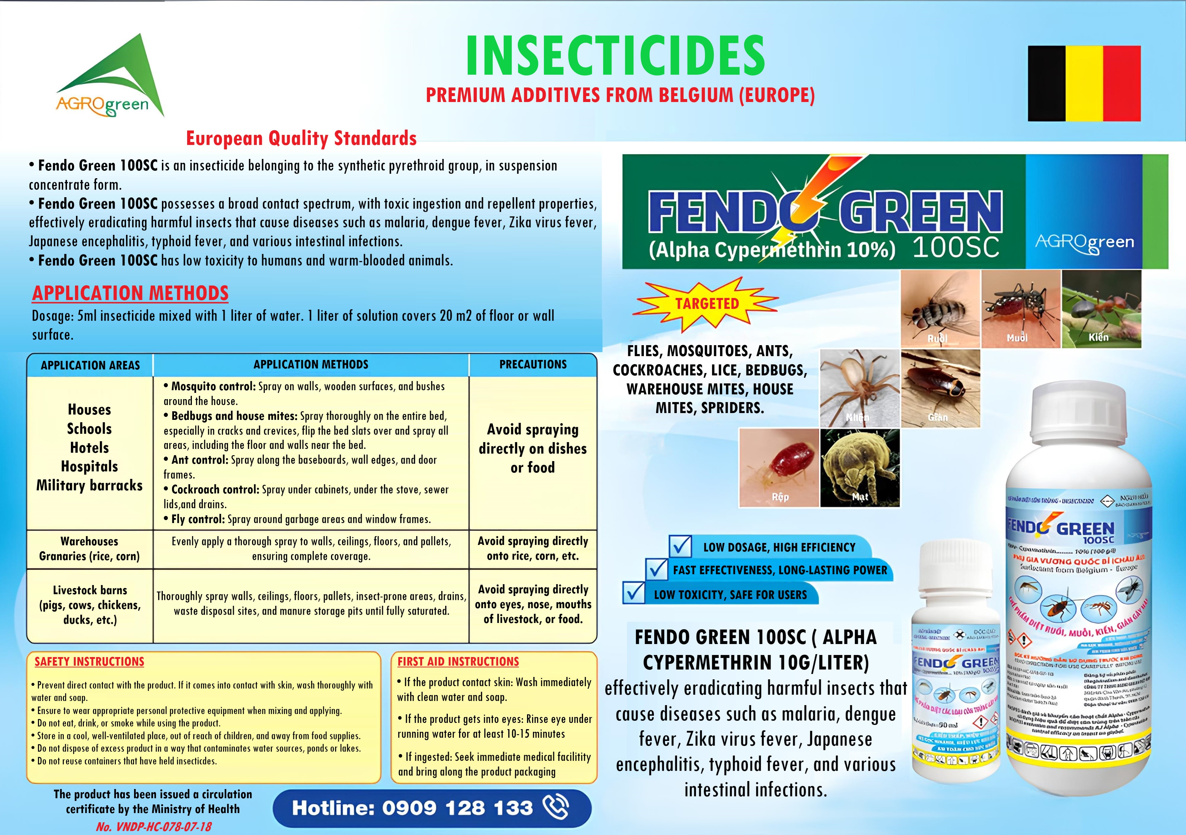 The product has been certified for circulation by the Ministry of Health with the certificate number: VNDP-HC-078-07-18, ensuring safety and effectiveness for users. Fendo Green 100SC Insecticide is the ideal choice to protect your living and working spaces from the dangers posed by insects.