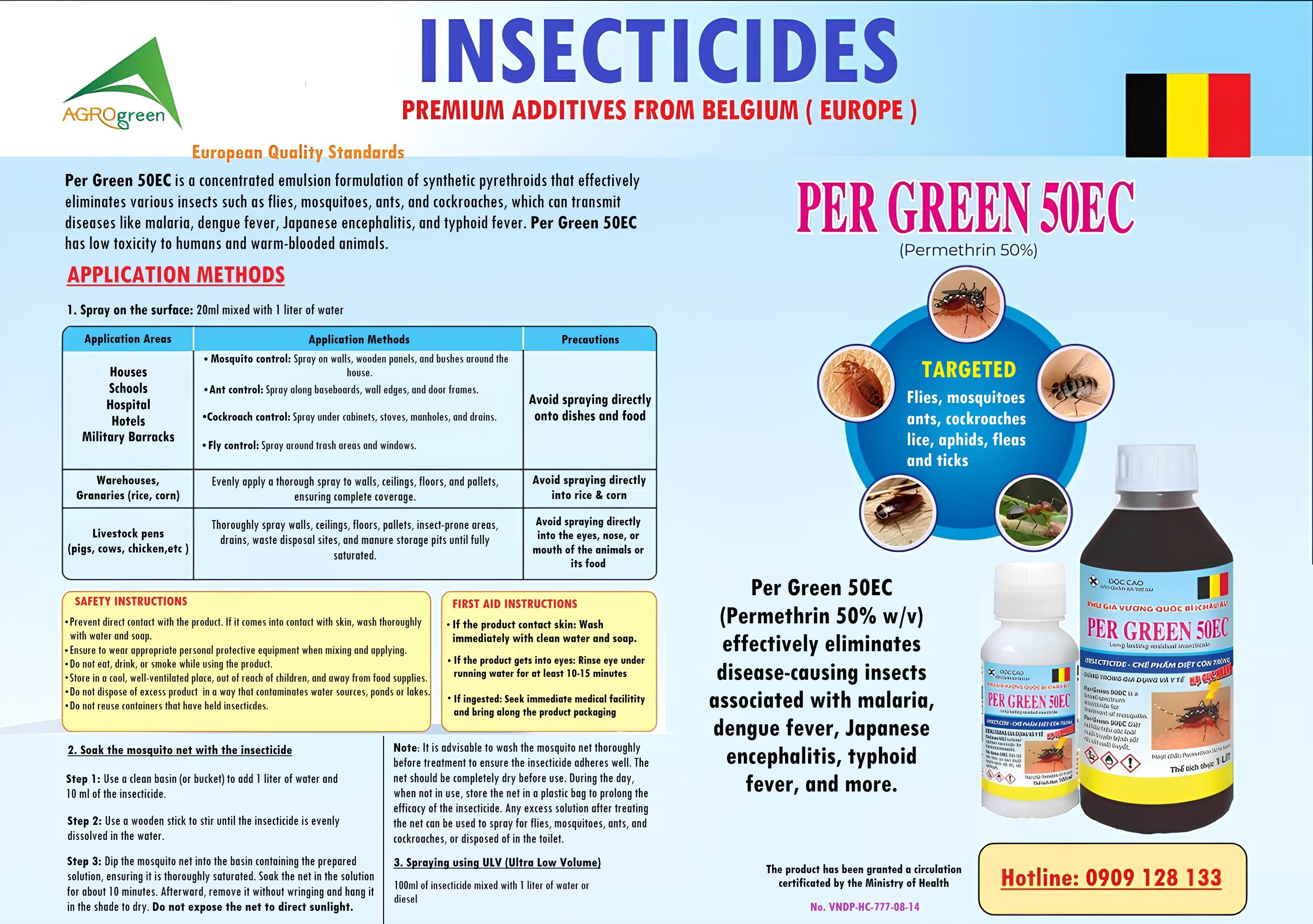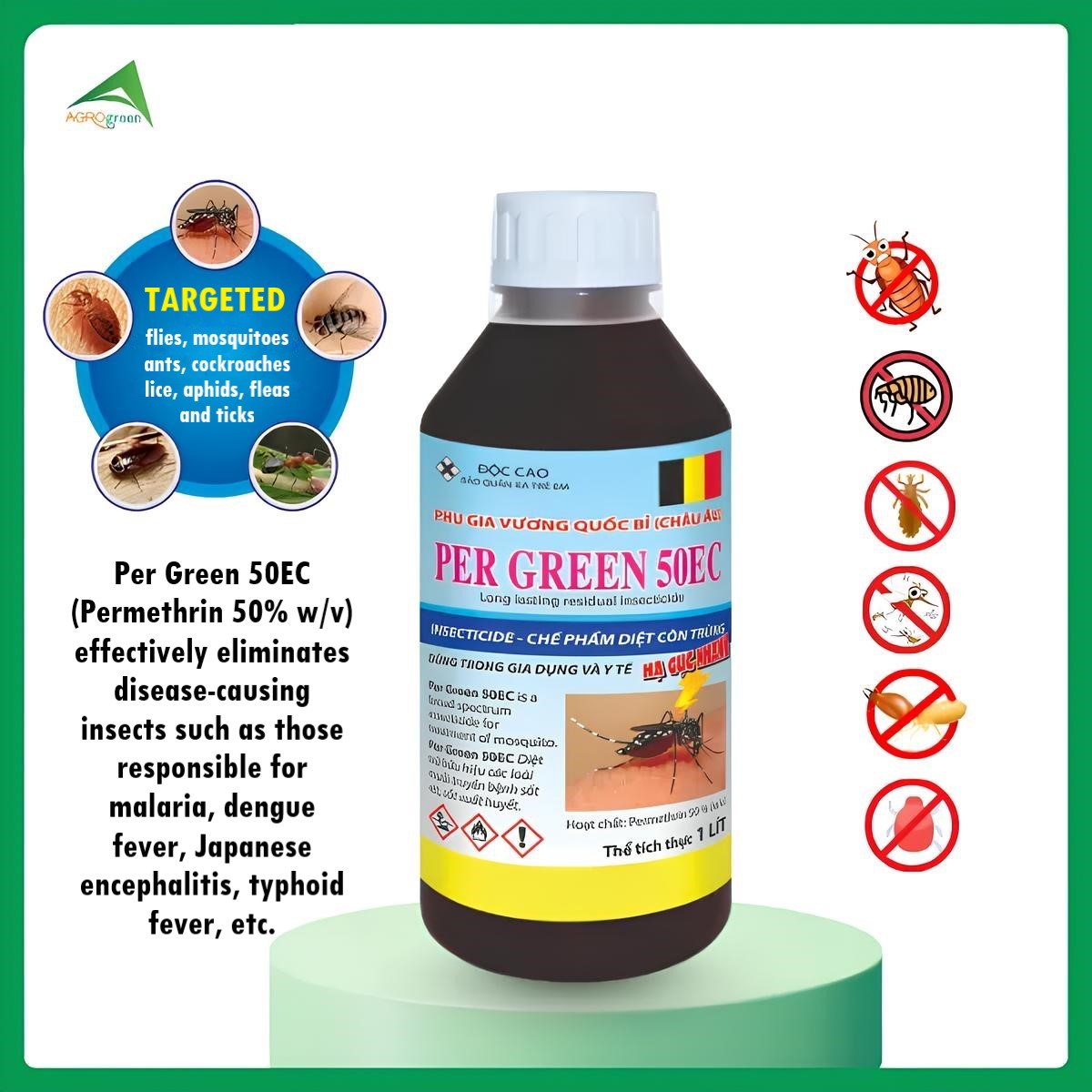 Per Green 50EC effectively targets various insects such as flies, mosquitoes, ants, cockroaches, lice, aphids, fleas, and ticks. This product is designed for complete elimination, helping to protect human and animal health from infectious diseases.