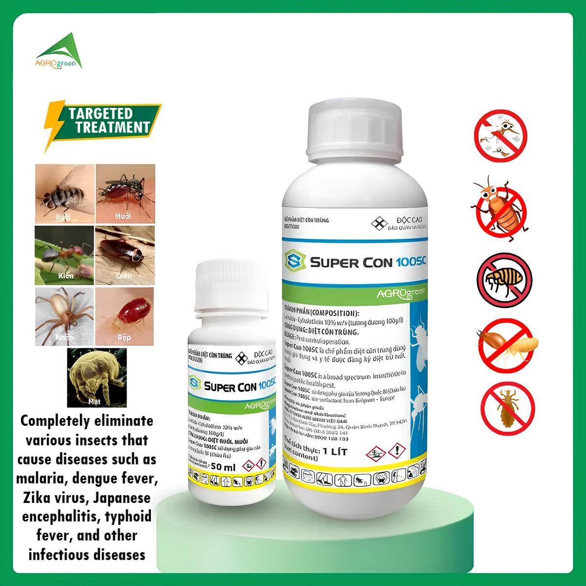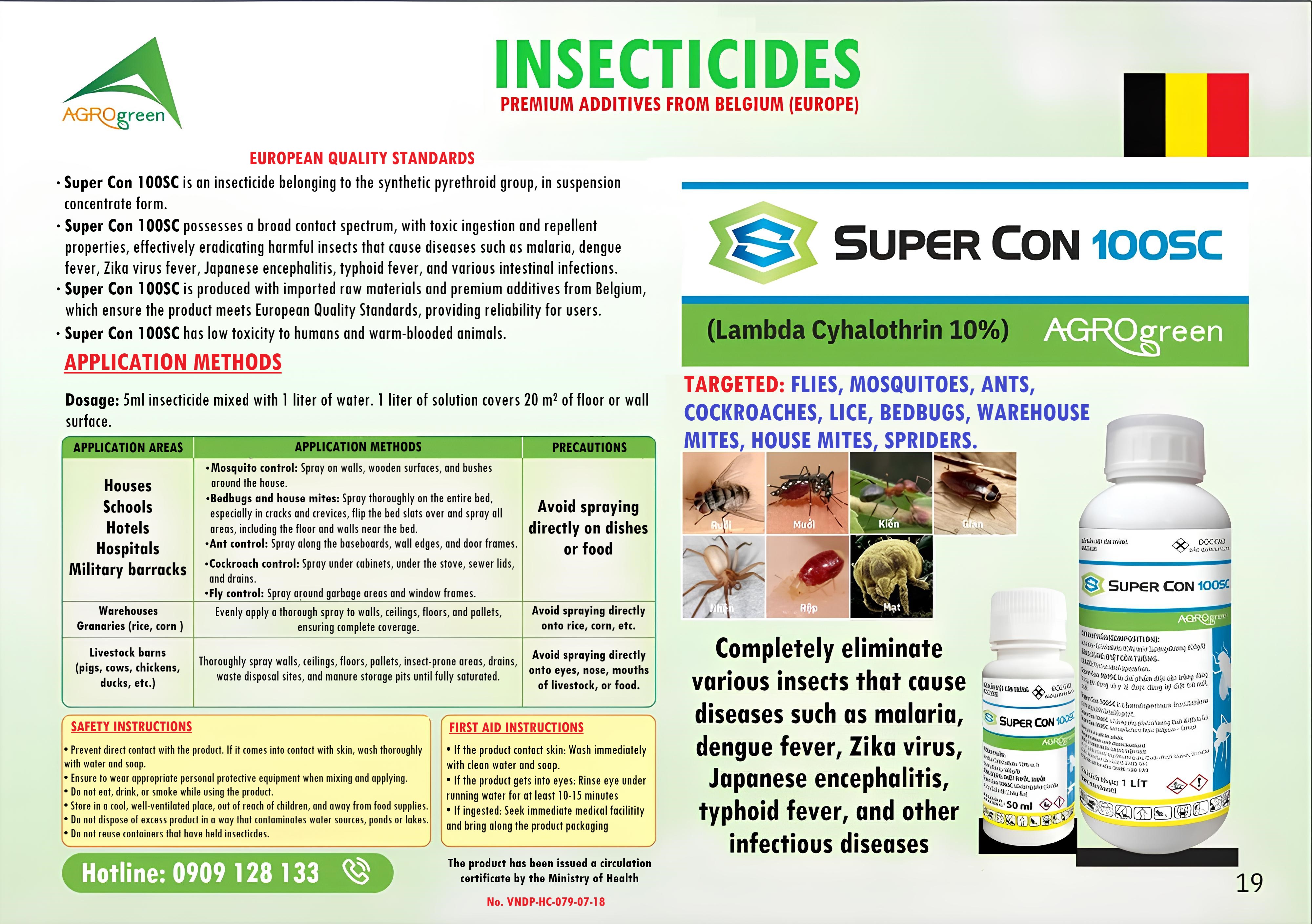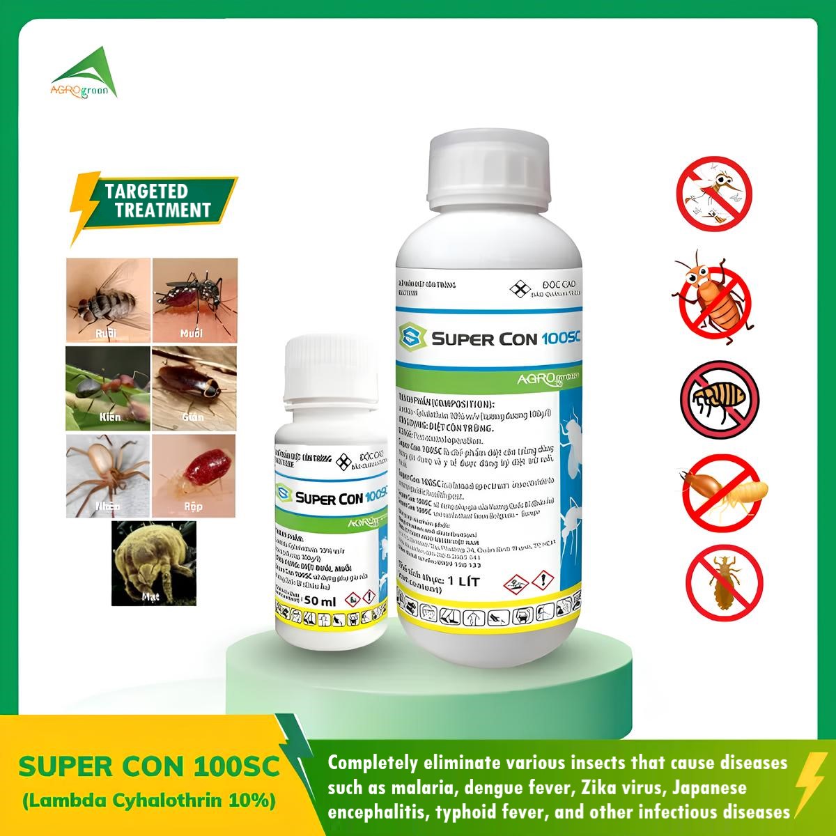 Super Con 100SC is a high-quality insecticide product with additives specially imported from Belgium. With its main ingredient being Lambda Cyhalothrin 10%, a compound from the synthetic pyrethroid group, Super Con 100SC is formulated as a suspension, delivering superior effectiveness in eliminating harmful insects such as flies, mosquitoes, ants, cockroaches, bed bugs, spiders, and dust mites. The product specifically targets dangerous disease-carrying insects, including those responsible for malaria, dengue fever, Japanese encephalitis, Zika virus fever, typhoid fever, and various other infectious diseases.